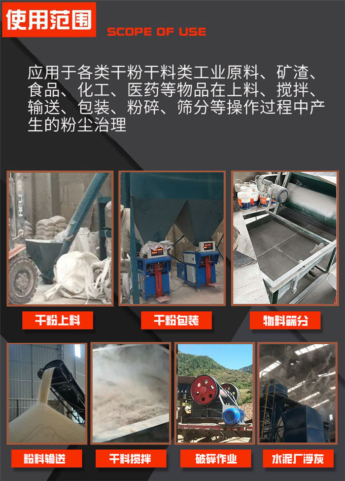 該設備為多袋式脈沖除塵裝置,當含塵氣體由進風口進入除塵器,首先碰到進出風口中間的斜板及擋板,氣流便轉向流入灰斗,同時氣流速度放慢,由于慣性作用,使氣體中粗顆粒粉塵直接流入灰斗。起預收塵的作用,進入灰斗的氣流隨后折而向上通過內部裝有金屬骨架的濾袋粉塵被捕集在濾袋的外表面,凈化后的氣體進入濾袋室上部清潔室,匯集到出風口排出,含塵氣體通過濾袋凈化的過程中,隨著時間的增加而積附在濾袋上的粉塵越來越多,增加濾袋阻力,致使處理風量逐漸減少,為正常工作,要控制阻力在一定范圍內(140--170毫米水柱),必須對濾袋進行清灰,清灰時由脈沖控制儀順序觸發各控制閥開啟脈沖閥,氣包內的壓縮空氣由噴吹管各孔經文氏管噴射到各相應的濾袋內,濾袋瞬間急劇膨脹,使積附在濾袋表面的粉塵脫落,濾袋得到再生。清下粉塵落入灰斗,經排灰系統排出機體。由此使積附在濾袋上的粉塵周期地脈沖噴吹清灰,使凈化氣體正常通過,保證除塵系統運行。