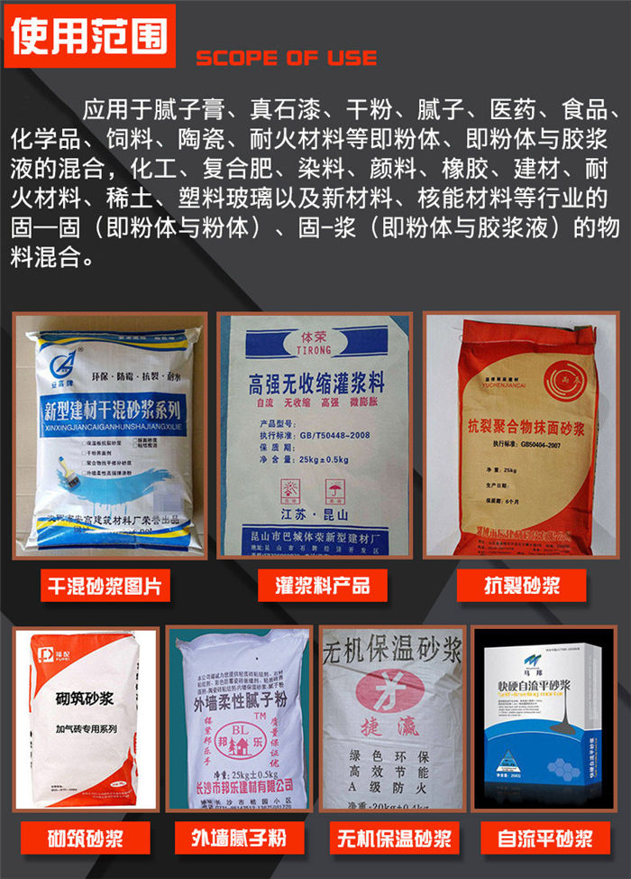該設備為全自動干粉砂漿攪拌機,整機四角加上料計量,適合多種物料混合的攪拌,設定好斤稱之后,物料由提升機上料,斤稱達到自動停止,然后接著上第二種物料,以此類推,計量準確,省時省力;出料系統設計也是電腦計量裝置,無需人工二次稱重,閥口袋包裝,無需再次封口,出料速度快,4秒一袋,1人即可操作,省時省力;攪拌機機身為臥式U型筒體,內部由內外兩層螺帶交錯布置,攪拌均勻,混合速度快,5至8分鐘即可攪拌均勻,出料可根據不同物料的實際需求定做多個出料口。